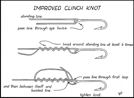 The clinch knot, or the improved version shown below, finds its best use where the length of line must be exact. The obvious example is in leaders, ie., the line between lure and ball-bearing swivel, most commonly the knot to the swivel. If you require a leader of 24 inches, for example, you can, with practice, learn to make a clinch knot that gives exactly 24 inches leader when tightened. Bulkier than the palomar, the clinch knot is most easily tightened on monofilament line. Braided line often proves too slippery for security; dacron has too much bulk to tighten-down onto itself.
