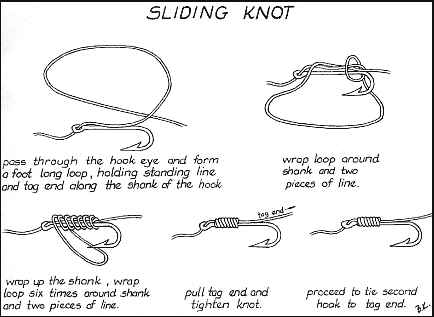 The sliding knot is used to tie a knot on the shaft of a hook, usually two singles in tandem or a trailing single with a leading treble. Sliding knots allow for movement of hook along the line and changing the plane of the hook, hence the name. This can be vital to producing that fish- tantalizing wounded-spiral action so desired in bait setups. When tying singles, make sure that the barb of each hook points in the same direction or one points down and one up. This leads to a smooth, balanced action in lures and aids presentation of bait.