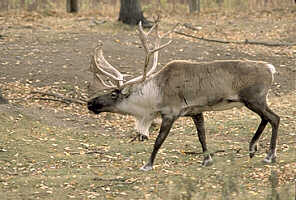 Biology - This species is among the most migratory of all animals. They feed on lichens, mushrooms, grasses, sedges and other green plants in the summer and twigs, horsetails, and willow in the winter. Caribou are great swimmers and run at speeds of up to 50 mph. The spongy foot pads provide traction on boggy summer tundra and in the winter when the pads have shrunk, hardened and are covered with tufts of hair, the hoof rim bites into ice or crusted snow to prevent slipping.